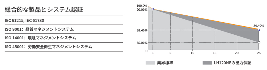 -1.00%初年度劣化率 -0.40%/年 2年目以降劣化率 12年製品保証 25年リニア出力保証