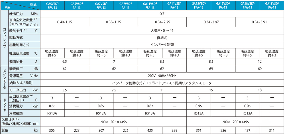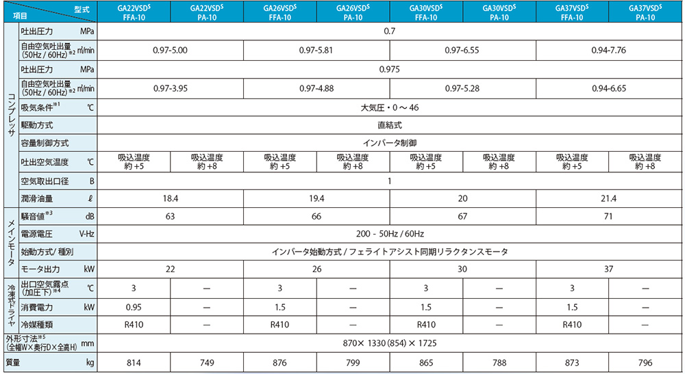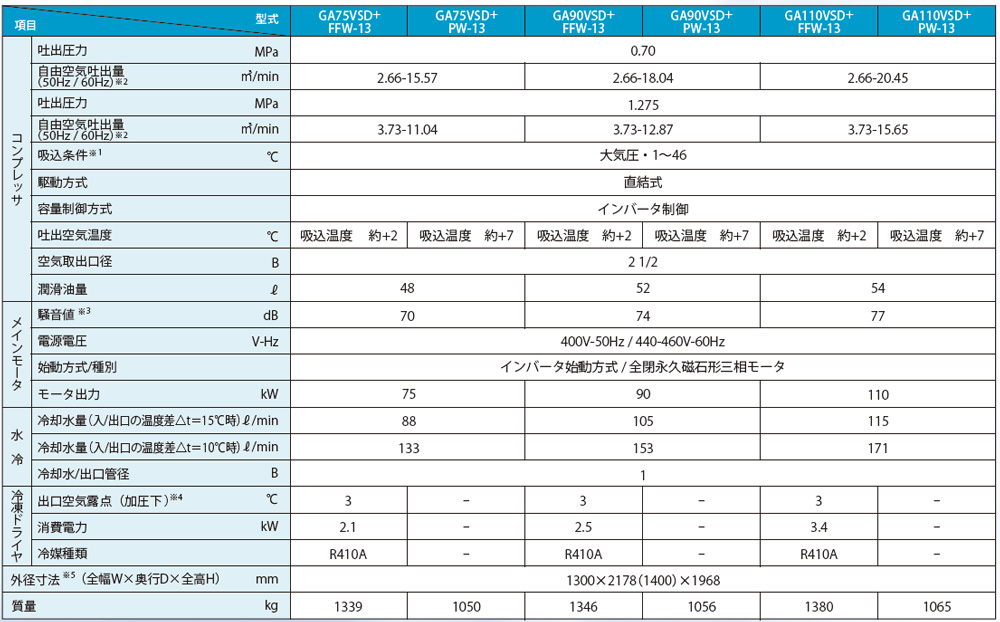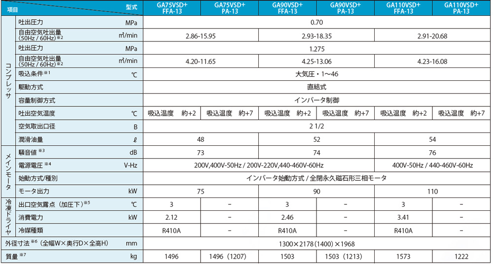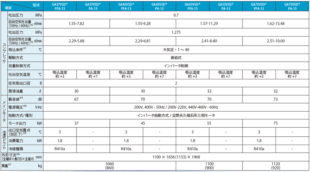 ※2. 表示の自由空気吐出量は、上記表の吐出圧力時の状態において ISO1217_ed4 2009, annexC 規格に基づき保証された値です。端数小数点第三位を四捨五入しています。