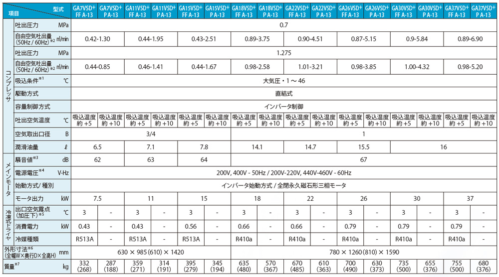 ※7.( )内は 400V/50Hz, 440V-460/60Hz 、PA(ドライヤなし)の仕様の質量です。